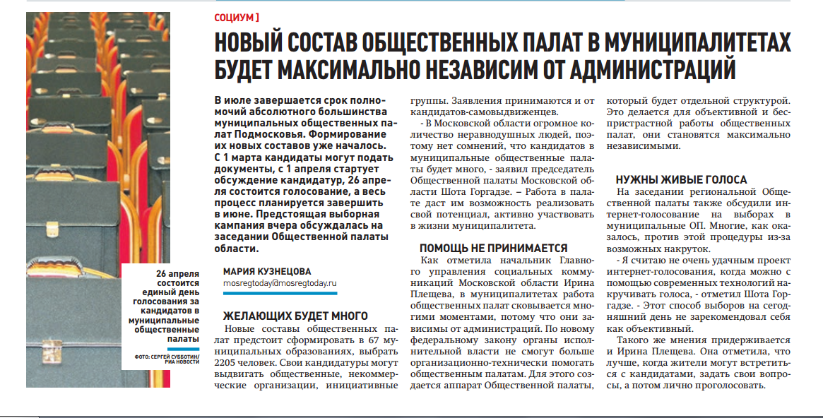 В июле 2017 года истекает срок полномочий действующих составов Общественных палат муниципальных районов (городских округов) Московской области. Работу по формированию Общественных палат в муниципалитетах осуществляет Общественная палата Московской области. Прием документов от кандидатов в члены Общественной палаты Городского округа Подольск завершится 31 марта. Времени у активистов для представления кандидатур осталось совсем немного. На данный момент подано 51 заявление от кандидатов в Общественную палату Большого Подольска.