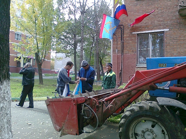 НЕТ-НЕТ, НИКТО И НЕ ДУМАЕТ НАПРЯГАТЬСЯ - ДАЖЕ ФЛАГИ ВЕШАЕМ НЕСПЕШНО, НА ТРАКТОРЕ РАЗЪЕЗЖАЯ ПО ПЕШЕХОДНОЙ ДОРОЖКЕ - ЭТО ЖЭК ТАК ЛЕСЕНКУ ВОЗИТ