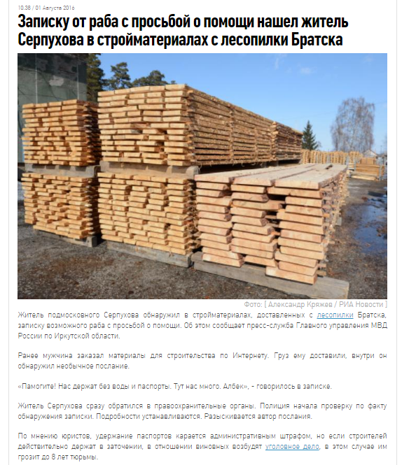 Житель подмосковного Серпухова обнаружил в стройматериалах, доставленных с лесопилки Братска, записку возможного раба с просьбой о помощи. Об этом сообщает пресс-служба Главного управления МВД России по Иркутской области.