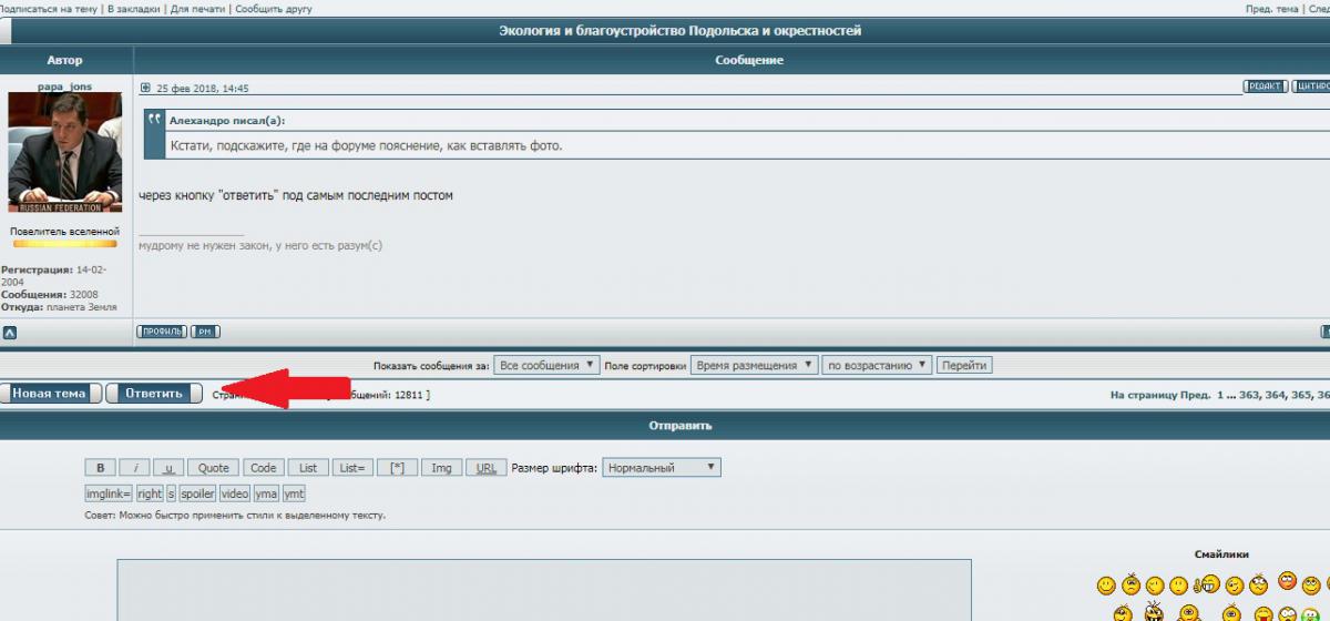 через кнопку "ответить" под самым последним постомАлехандро писал(а):Кстати, подскажите, где на форуме пояснение, как вставлять фото.