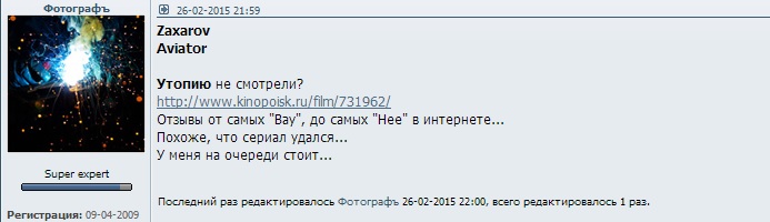 Ой, да, прошу прощения, это был фотограф:mike писал(а):точно я? сериал неплохой, но по-моему его рекомендовал кто-то другой. Фотографъ или Авиатор советовали имхо...Zaxarov писал(а):По вчерашней рекомендации mike посмотрел сегодня первый сезон Утопия.