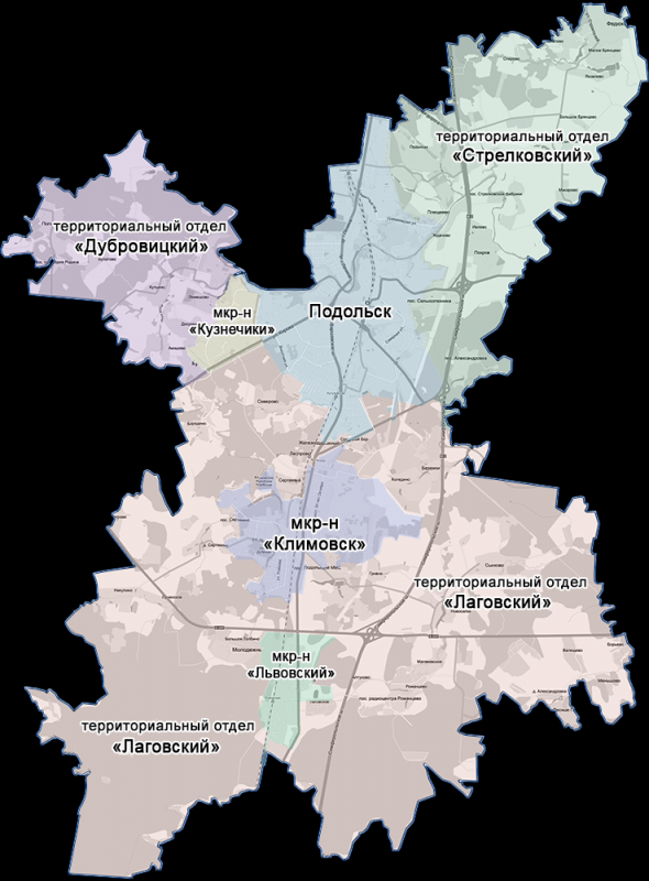 Схема микрорайонов городского округа Подольск. Обратите внимание, что здесь правильно указаны названия отделов, переименованных из микрорайонов.