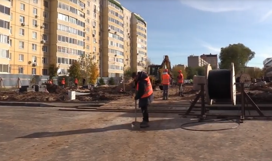 В проморолике о строительстве пешеходной зоны на улице 50 лет ВЛКСМ показывают, как рабочий соскребает лопатой с асфальта грязь, вынесенную колесами строительной техники (0:54). Это административное правонарушение.