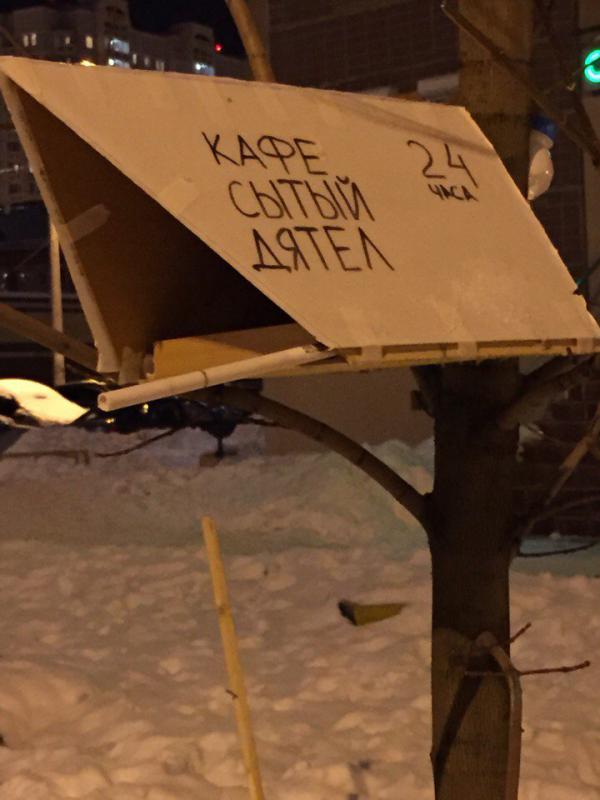 Кафе для птиц появилось в подмосковном Подольске. Так, жители сколотили кормушку для пернатых и написали на ней название «Кафе “Сытый дятел”». Оно работает круглосуточно. Сейчас туда прилетают синицы и воробьи. Об этом рассказала местная жительница Светлана Соловьёва.