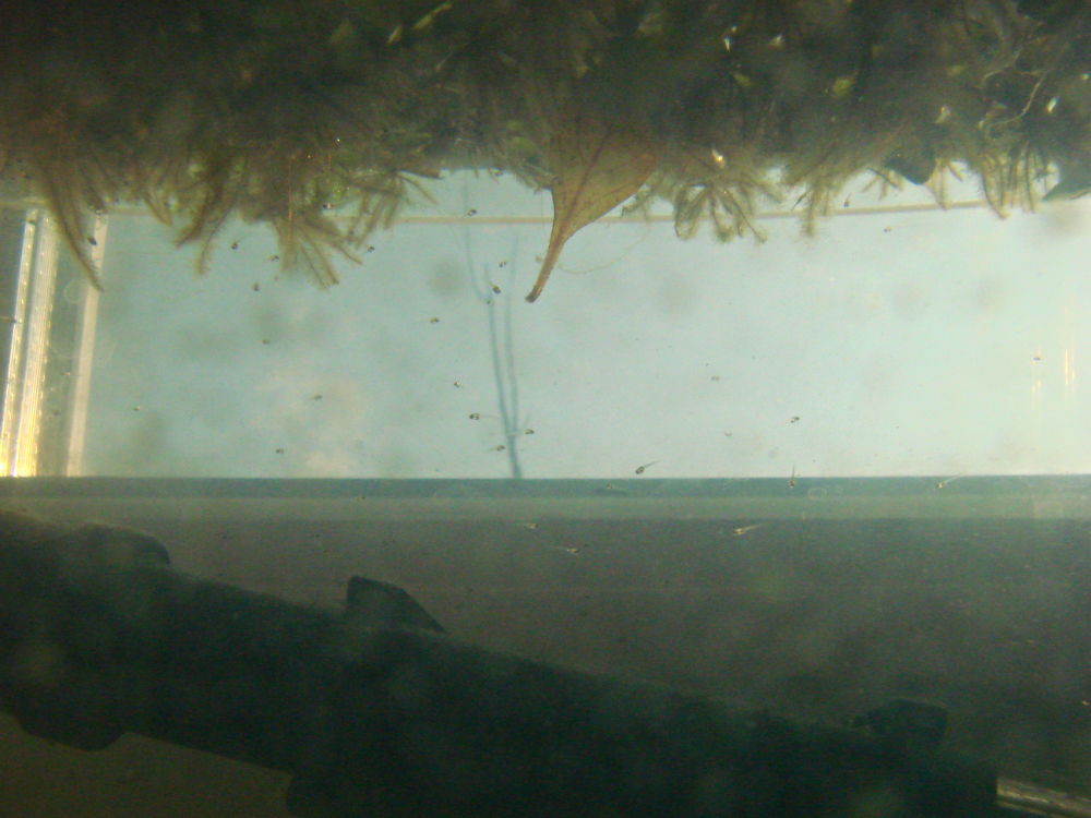 Уф, только что закончила с оборудованием отсадника. Мальков вылавливала тупо банкой. Сколько их там точно не знаю (очень маленькие и быстро прячутся, но думаю, что не больше 10-12 шт. На моих глазах пару мальков слопали мальки гупёх, которые достались мне с креветками.