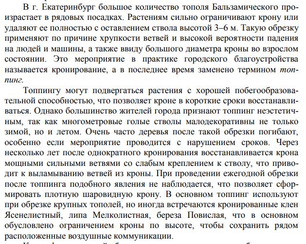 Про топпинг и кронирование я и до Вашего сообщения в поисковиках поискал информацию, поэтому и спросил. В приведённых Вами документах определения топпинга я не увидел. Так всё таки есть какой-нибудь официальный нормативный документ с определением топпинга и его отличия от кронирования, типа длина и толщина обрезанных ветвей от ствола и подобное. То есть документ, где указано чёткое определение понятий, а не их эмоционально-эстетическая оценка. А то складывается такое ощущение, что в интернатах пишут все кто как сам это понимает, а под Ваше определение топпинга большинство деревьев на фотографиях Летучки не подпадают, так как на них остаются какие-нибудь ветви, пусть короткие и обрезанные, отходящие из ствола. :)