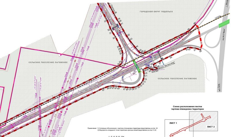 По схеме новая трасса идет через нетронутый лес, там можно сказать парковая зона, и летом и зимой полно народу, лыжная трасса, велосипедисты и просто отдыхающие. Схему точно рисовал идиот, после леса, трасса идет прямо через пруд и очень близко к кладбищу. далее через все поле, на котором каждый год что то высаживают, видимо Совхоз "Подольский" еще жив, далее должна быть новая эстакада через ЖД. И тут самое интересное, там стоят жилые дома