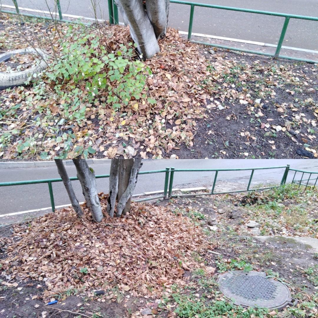 Почему под деревьями, где типа газон и аллеи, были сметены опавшие листья? Это давно уже запрещено и карается административно, так как вредит почве. Кроме того, согласно ст. 64 Закона Московской области № 191/2014-ОЗ «О благоустройстве в Московской области» в период листопада производится сгребание и вывоз опавших листьев с проезжей части дорог и дворовых территорий. С проезжей части, но никак не с газонов! Вы лишаете деревья естественной защиты во время зимы. Обращаю внимание, что проезжая часть при этом остается вся в листве. Прикладываю также прошлогодний ответ: вы повторяете ошибки.