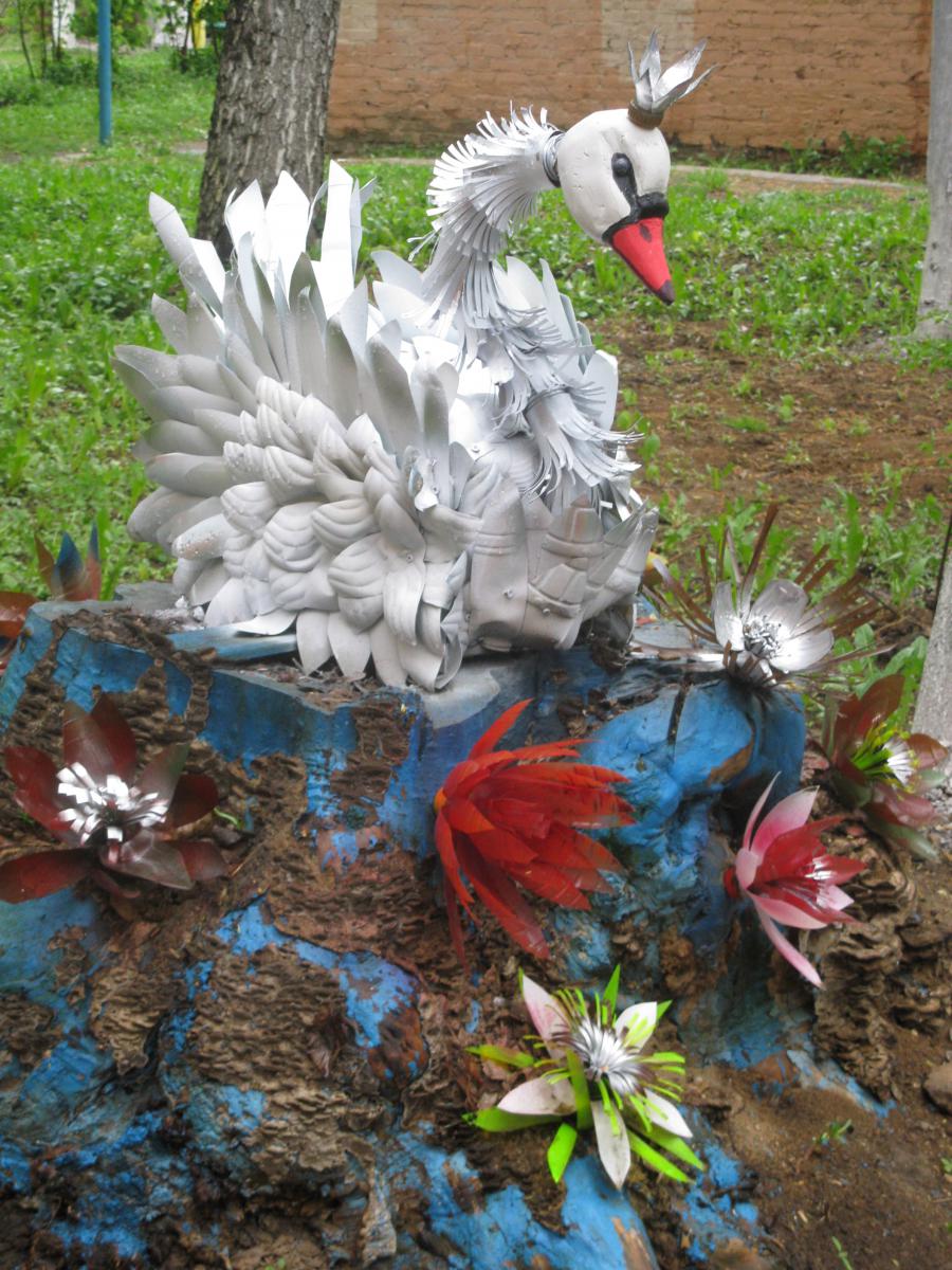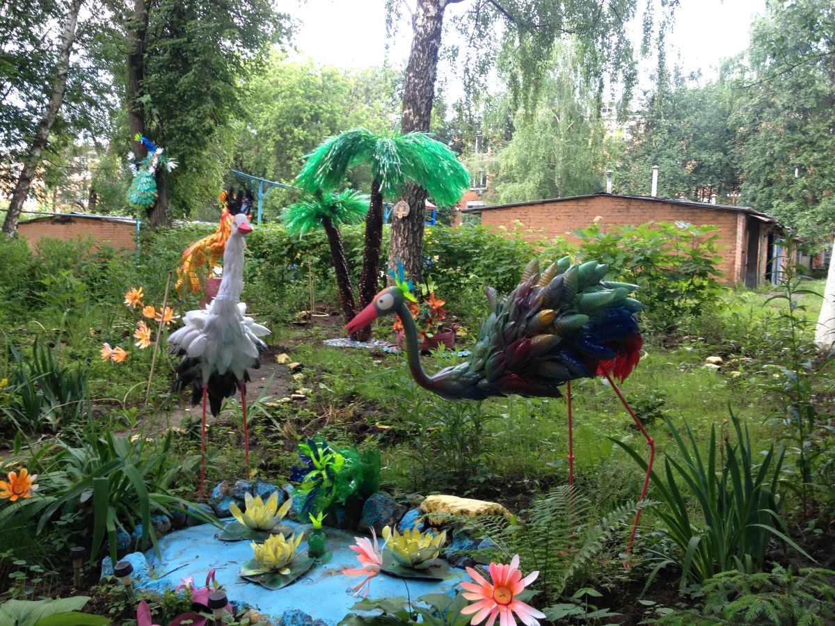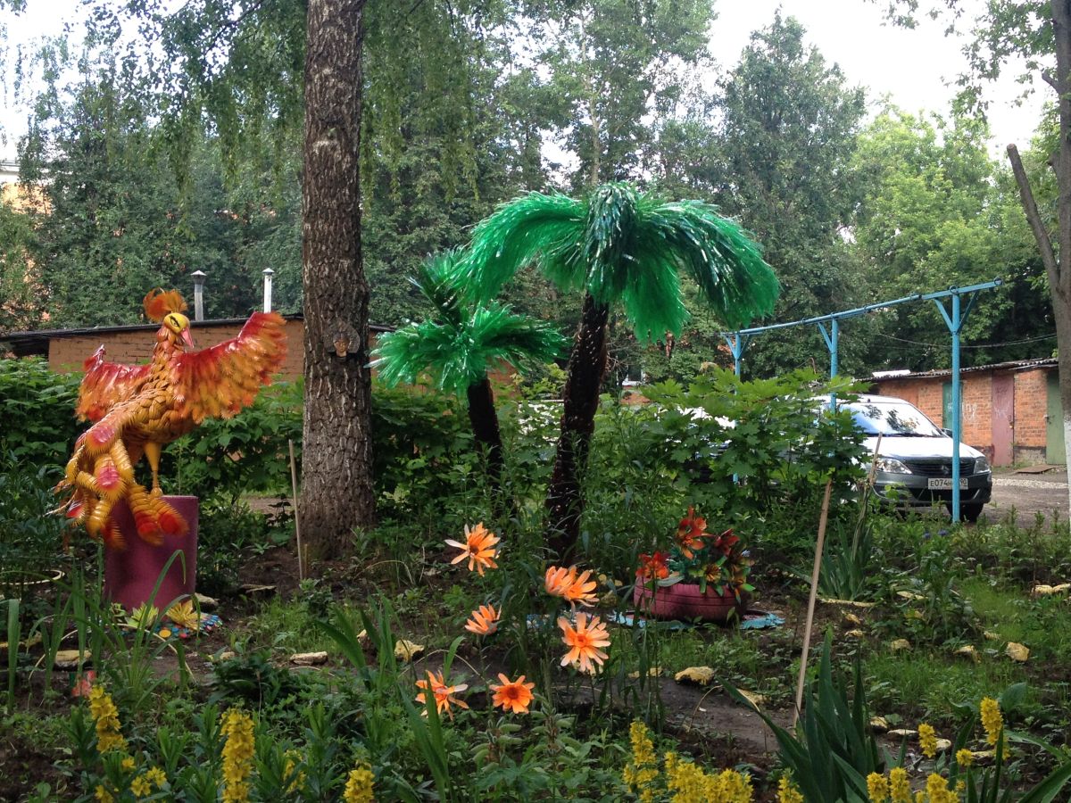 Часто хожу мимо этого дворика, довольно наивно и неуклюже все сделано. Только наклонная цаплястраус получилась пластичная, душевная. Но. у кого то неплохая техника работы с мягкими материалами, я так понял там многое из стаканчиков сделано или подобного пластика. В сумме хоть и пестро - но мило. И главное что не смотря на кучу праздношатающихся подростков, алкашей и гастарбайтеров, дворик не тронут.