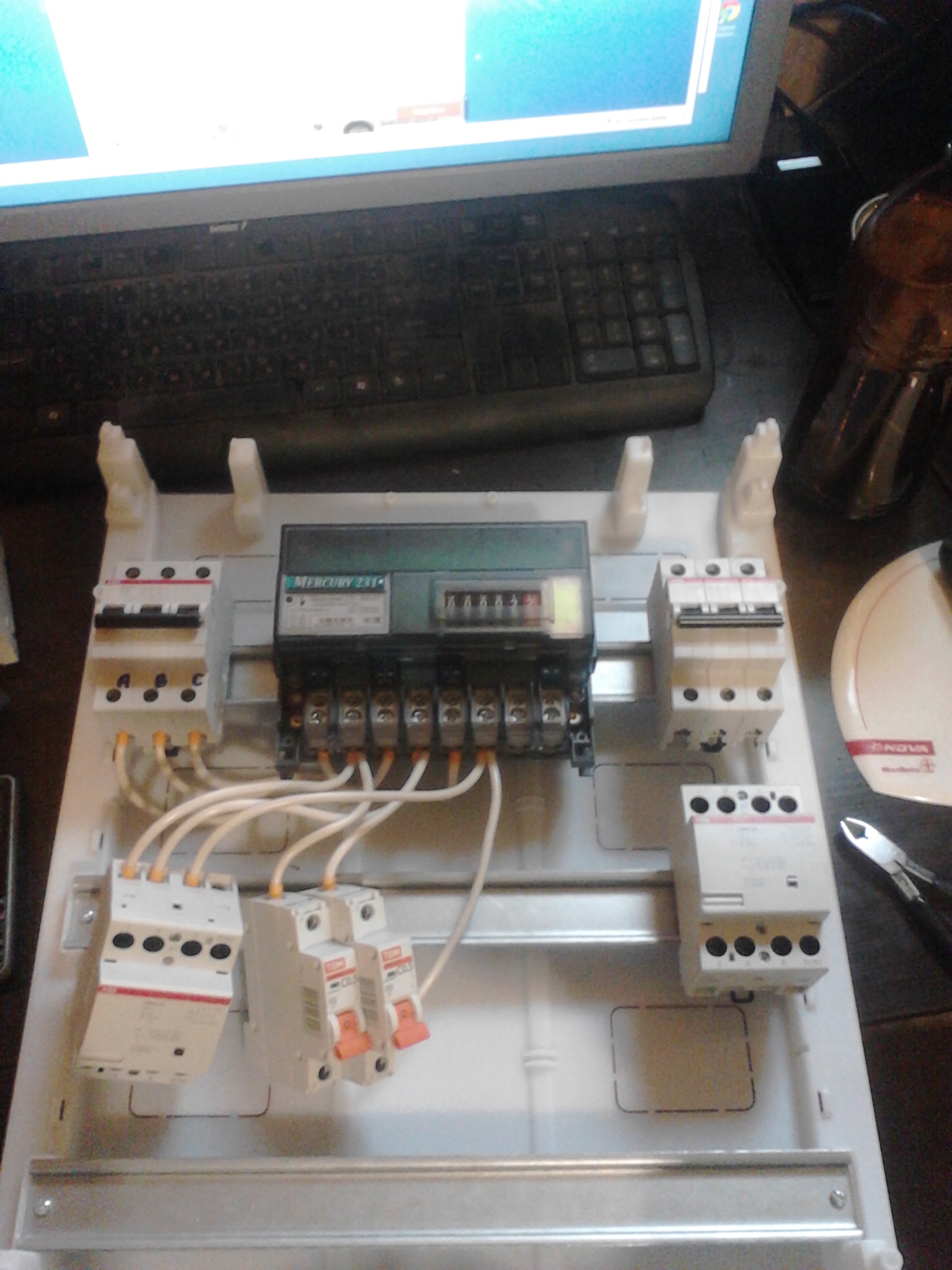 Нижняя рейка справа должна ещё принять три токовых трансформатора ABB 40/5 и индикатор потребляемого тока по каждой фазе WT-3-75 (пока не приехал заказ).