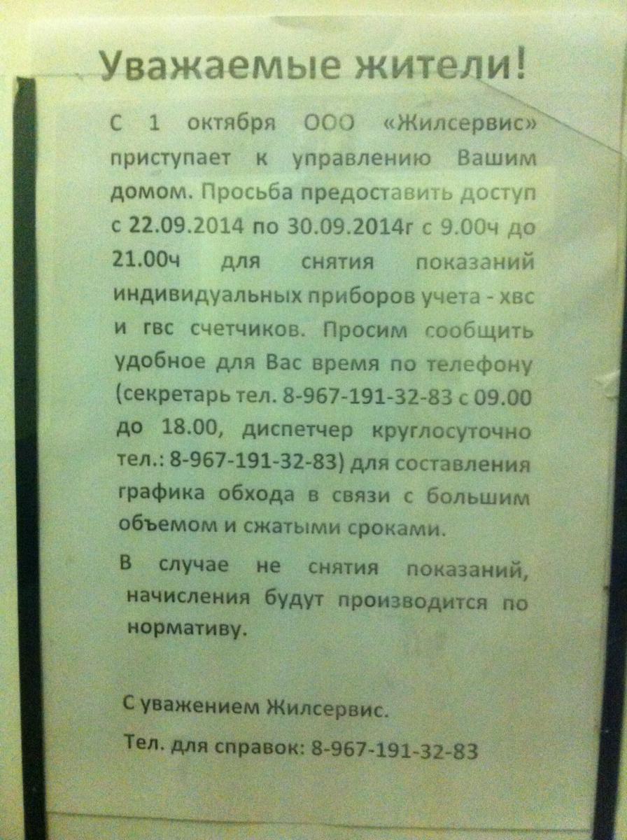 ЛСвета писал(а):Сегодня с 7 часов ждала сотрудников нашей новой управляющей компании, для снятия показания счетчиков воды, так и не пришли.