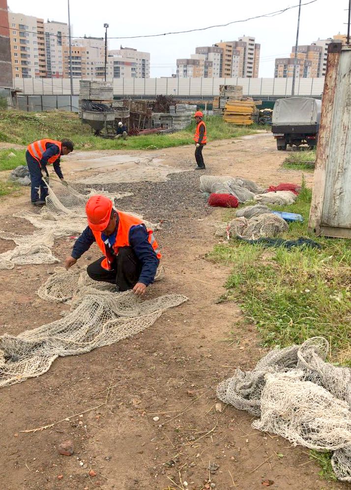 Подрядчик касками всех обеспечил (на новых фото есть отдельные люди в касках), но рабочие самостоятельно их проигнорировали. Замечание днем подрядчику поступило, обещали обратить на это внимание и обязать каски одевать. А пока прилагаю еще несколько фото от сегодняшнего утра.