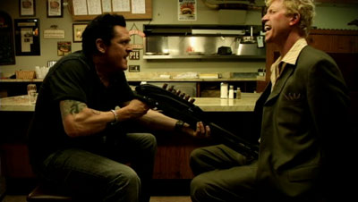 Ааатличный камерный детективчик с оригинальным сценарием.На сей раз расследование ведет маньяк-психопат. Придорожная забегаловка в американской глухомани.Жара.Пендосы - посетители лениво жуют свой баблгам.Внезапно,по радио в новостях сообщают,что неподалеку зверски убита семья фермера.Пендосы негодуэ ктоэта.Затем в дверях заведения появляется великий и ужасный Майкл Мэдсен,ну и,как водится,начинает всех пытать...