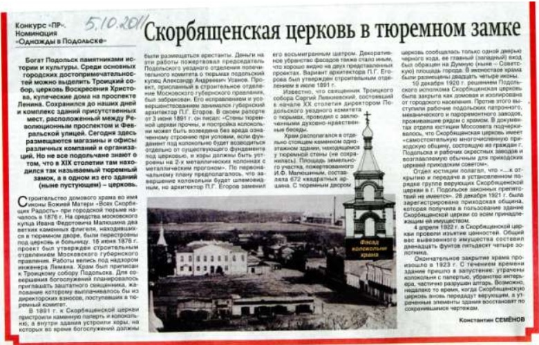 Храм во имя иконы Божией матери «Всех скорбящих радость» строился при городской тюрьме в 1876 году на средства московского купца Ивана Федотовича Малюшина. Храм был приписан к Троицкому собору и располагался в отдельно стоящем каменном одноэтажном здании, находящимся у тюремной стены, вход был обращен на Думную, ныне Советскую площадь. 10 декабря 1920 года решением Подольского исполкома Скорбященская церковь была закрыта и из олирована от городского населения. Против этого выступили рабочие подольских патронного, механического и пароремонтного заводов, проживавшие рядом с храмом. В отделе юстиции Моссовета полагали, что к открытию церкви законных препятствий не имеется. И 28 декабря 1921 года была зарегистрирована приходская община, которая получила в пользование здание Скорбященской церкви со всем принадлежащим ей имуществом. 4 апреля 1922 года в Скорбященской церкви произвели изъятие ценностей. Окончательное закрытие храма произошло в 1923 году.