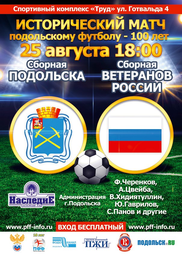 В Подольске состоится матч между Сборной командой ветеранов г. Подольска и Сборной ветеранов России, приуроченный к 100-летию футбола в городе. Игра пройдет в воскресенье 25 августа 2013 года на главном поле СК «Труд». Начало в 18:00. Вход бесплатный.