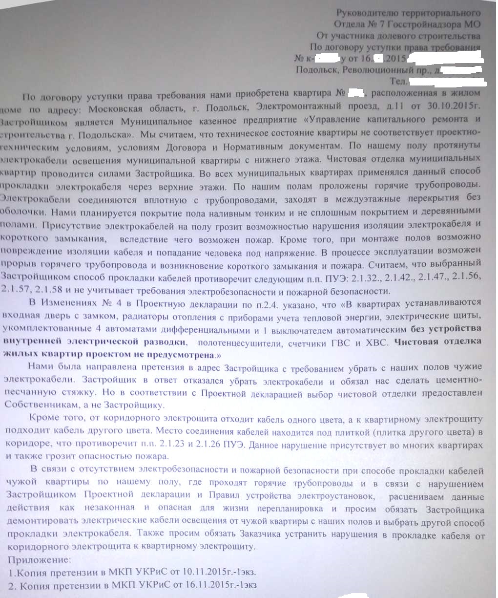 Жалобу на электрокабели на полу и наращенным кабелем отдали в Администрацию. Ходили в Госстройнадзор, инспектора не было, но нас связали по телефону и он выслушал и поговорил с Заказчиком, директором по строительству. Тот обещал убрать кабели с пола. Представители Заказчика сказали, что проблемы с электрикой они знают и будут разбираться. Сегодня постараемся сдать жалобу в Госстройнадзор, хотя приемный день пятница.
