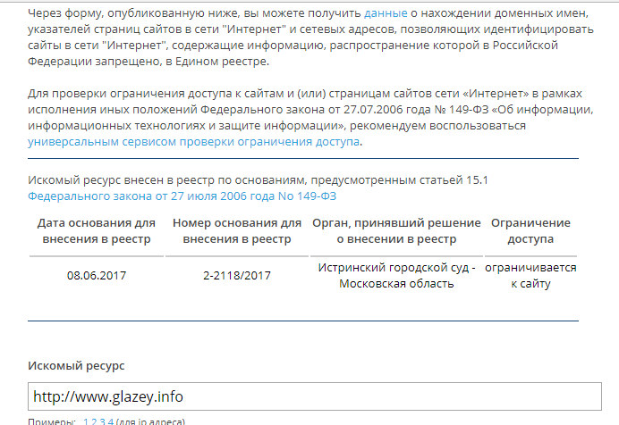 Основанием для блокировки послужило решение Истринского городского суда Московской области, вынесенное 8 июня 2017 года. Заявление в суд подал Истринский городской прокурор, а стороной в деле выступала Федеральная служба по надзору в сфере связи. Движение дела можно посмотреть на сайте суда, к сожалению, текст решения не доступен. Указано только, что решение суда обжалует ООО "Сириус". Эта фирма, которая владеет сайтом Glazey.info. В 2015 году владелец другого популярного серпуховского сайта - Smitanka.ru - судился с ООО "Сириус" из-за названия "Glazey".