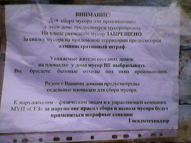 Люди кладут мусор под бумажками ГАТН о запрете складирования мусора (в доме есть мусоропровод, но соседям из окрестных домов удобно нести