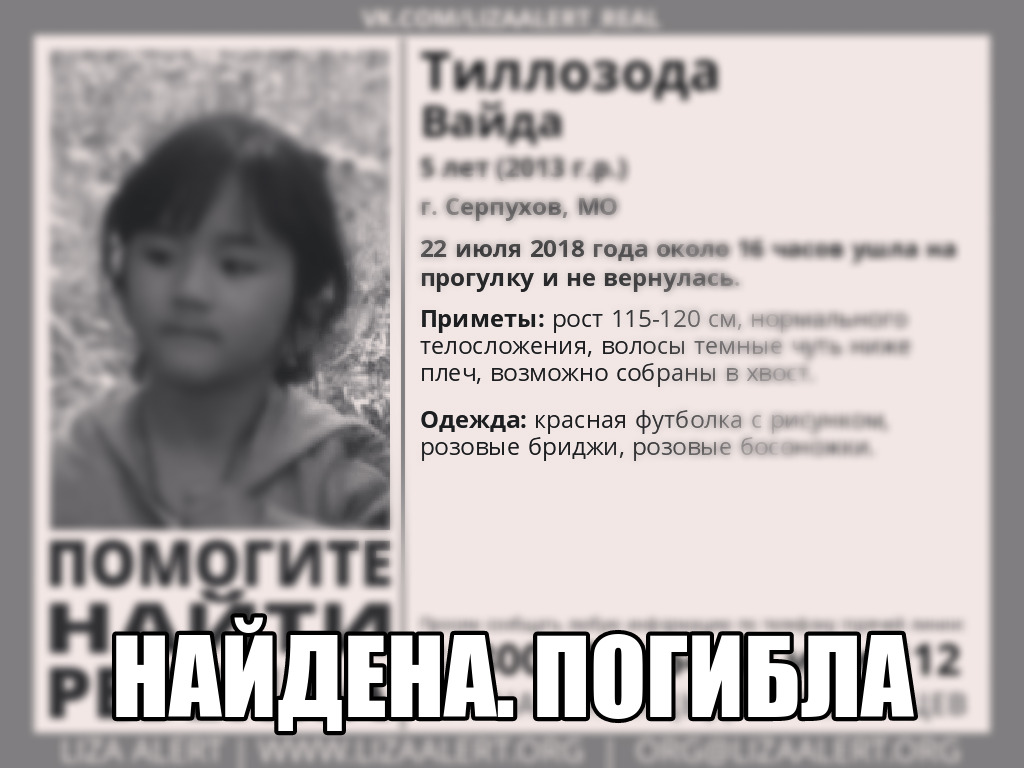 В понедельник, 23 июля, О.Врадий сообщила Агентству «Москва», что в Серпухове задержали мужчину 1990 г. рождения, подозреваемого в убийстве пятилетней девочки. По словам собеседницы агентства, 22 июля с детской площадки в Серпухове пропала пятилетняя девочка. На следующий день вблизи железной дороги в Серпухове была найдена спортивная сумка, в которой находилось тело убитой.