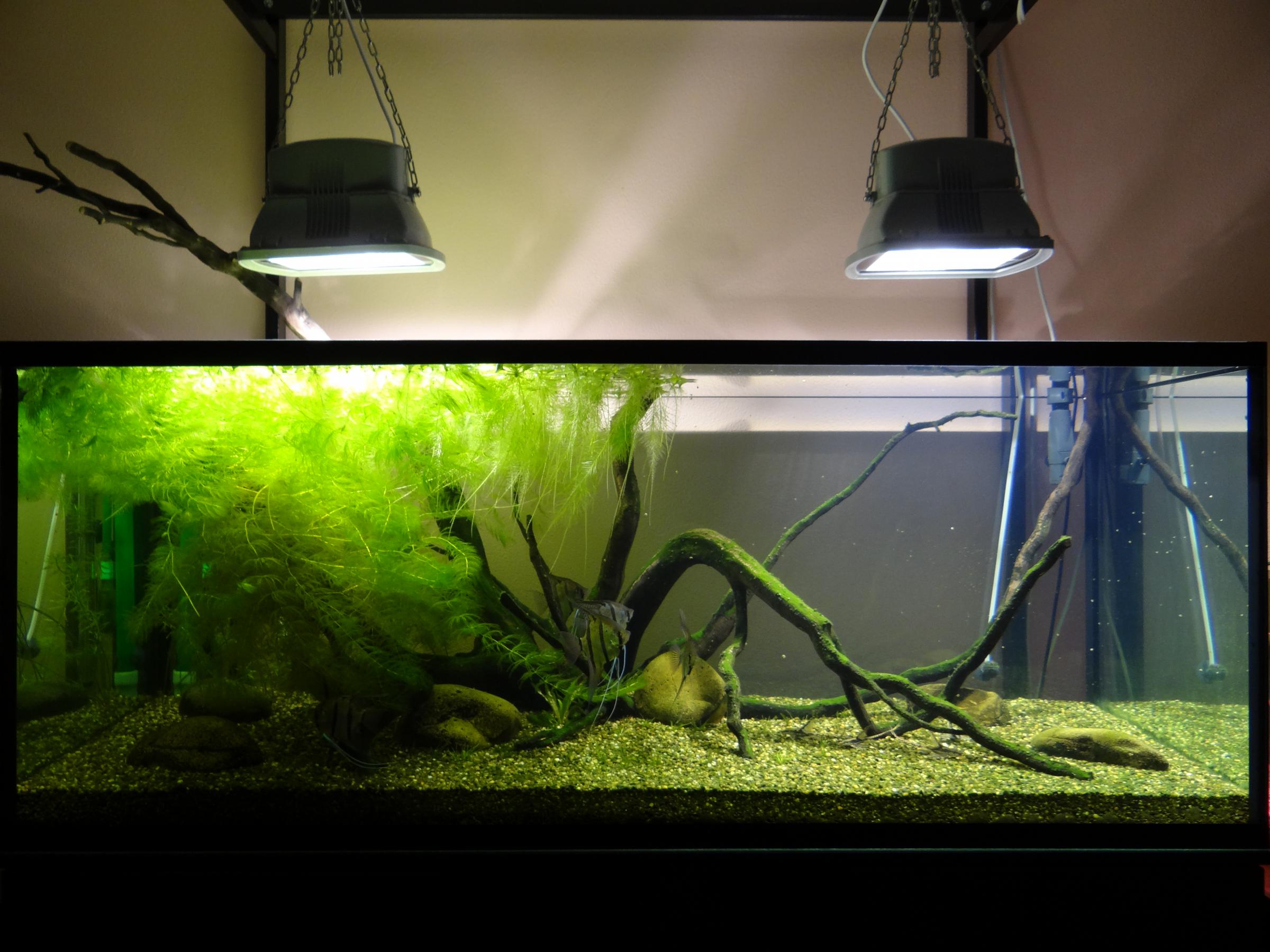 Визуально (фотография этого не передает из-за засветки) разница в силе света от разных источников в этом аквариуме отличается в разы. Высота водяного столба в нем - 50-55 см. Под ЛЛ-ками Элеохарис парвула совсем не рос, а под МГ он пузыряет, хотя потребляемая мощность уменьшилась.