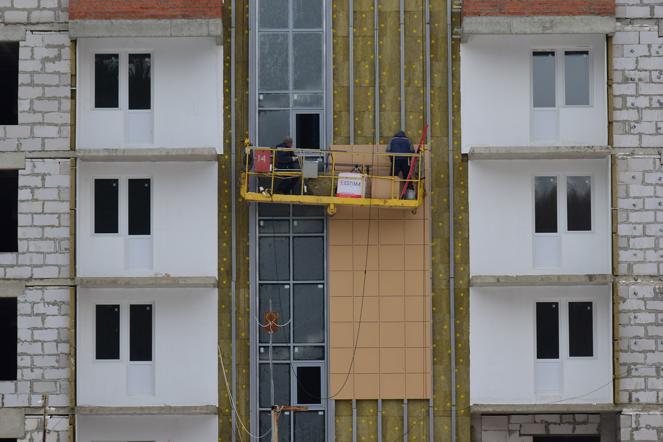 Строители сегодня начали навешивать керамогранит на фасад дома №2.