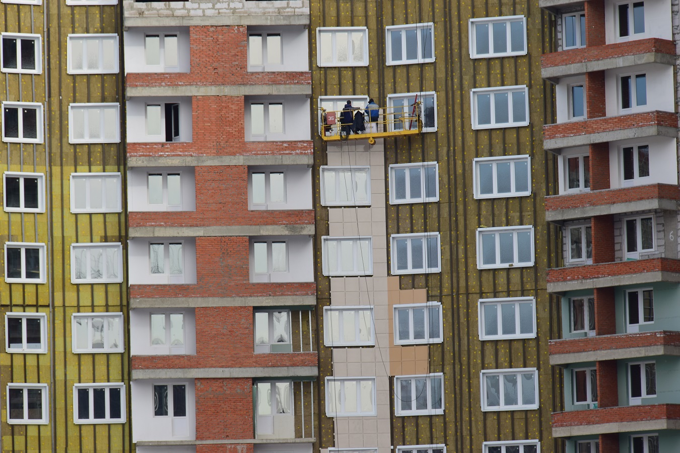 Строители сегодня начали навешивать керамогранит на фасад дома №2.