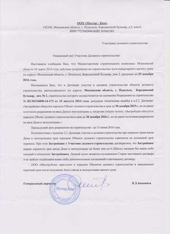 На днях получил "пакет" от нашего уважаемого застройщика "Мастер-кома". И ни черта не понял из той абракадабры, которая написана в этом послании. Кто может внятно растолковать: какая связь между разрешением на строительство дома №2,его последующим продлением, и нашими ДДУ, со сроками сдачи дома указанными там и т.к. называемой технической ошибкой,якобы допущенной распи...ем сотрудником составлявшим наши договора? Хотя и сейчас ясно,что все сроки практически прое....ли,и к 31 июня не успеют сдать дом №2. Прикрывают свою задницу, чтобы не завалили дольщики неустойками за срыв срока сдачи дома? По моей информации большинство соседей не подписывали новый ДДу...Первоначальный ДДу остаётся в силе. Или это послание носит только информативный характер? Вообщем понятно,что ничего не понятно. В "Каскаде" толком ничего не пояснили...типа не в курсе...Лучше бы написали когда реально сдача дома будет..