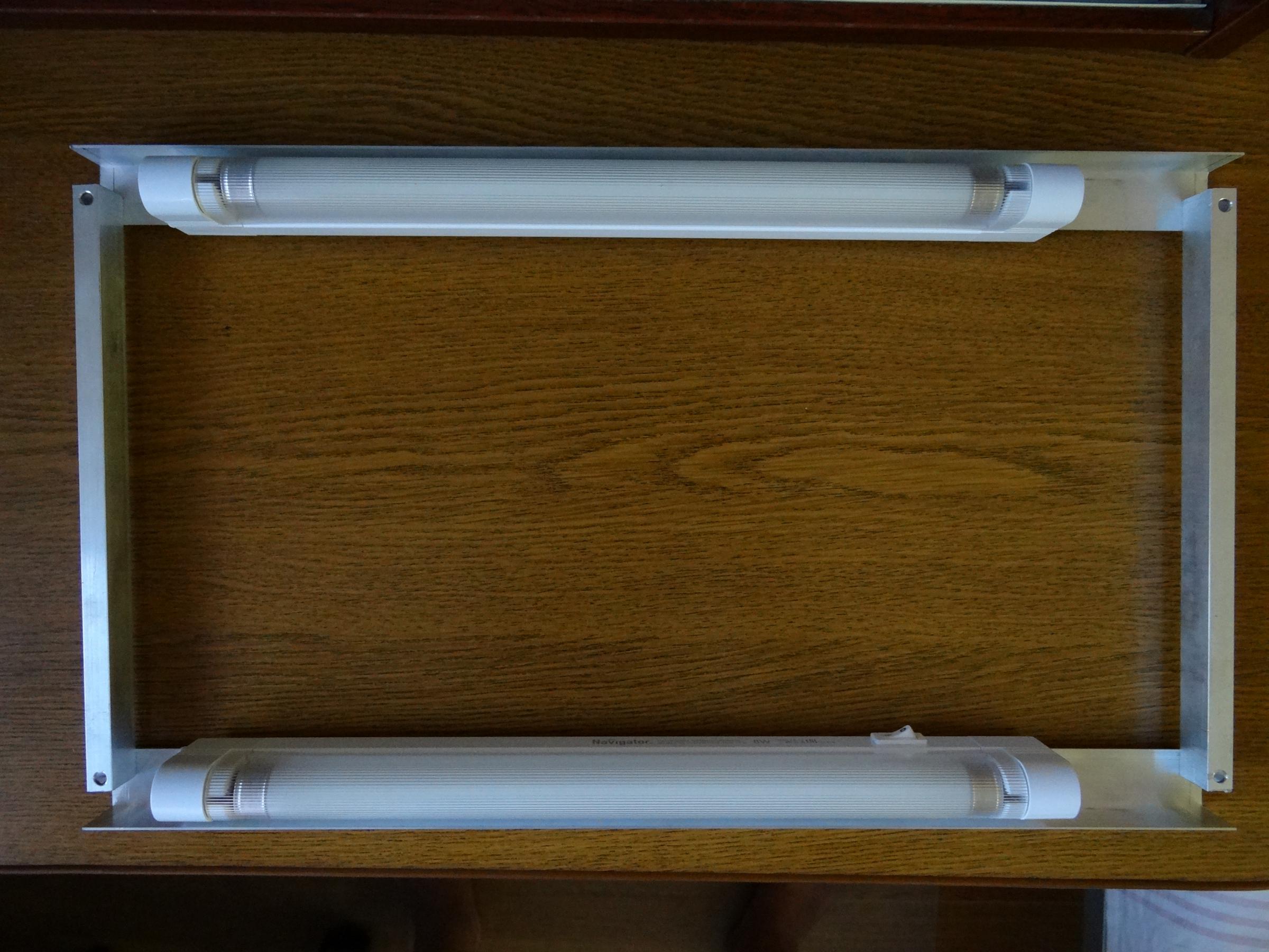 Сверху на уголки прожектора кладется каркас с ЛЛ-ками. У меня ЛЛ-ки без претензий. Обычные ГОТОВЫЕ Т5 светильники из Castorama - Navigator NEL–B2: