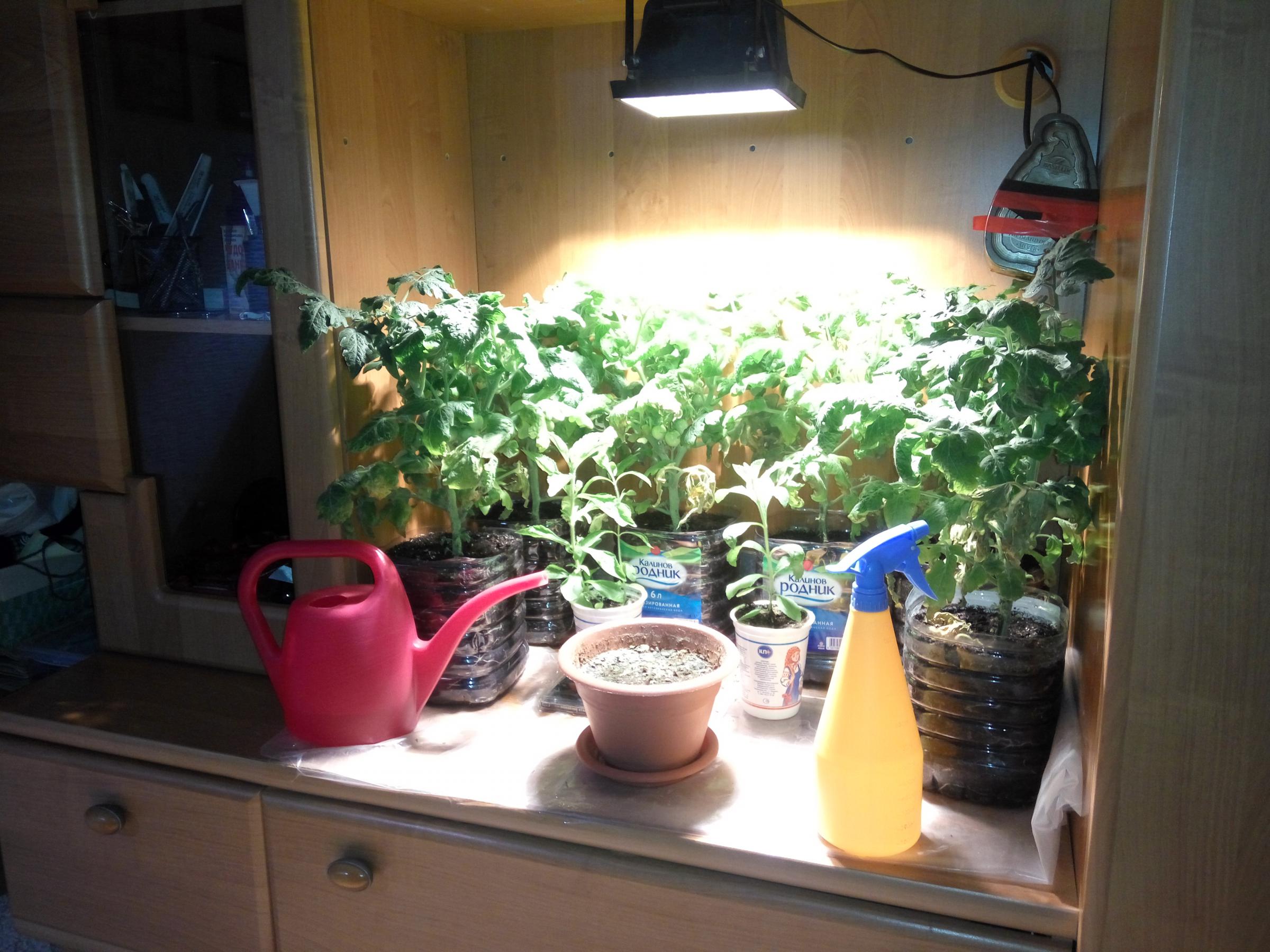 А это это мне зелени захотелось зимой. Черри под металлогалогенкой, а перед ней стевия. Уже сладкая
