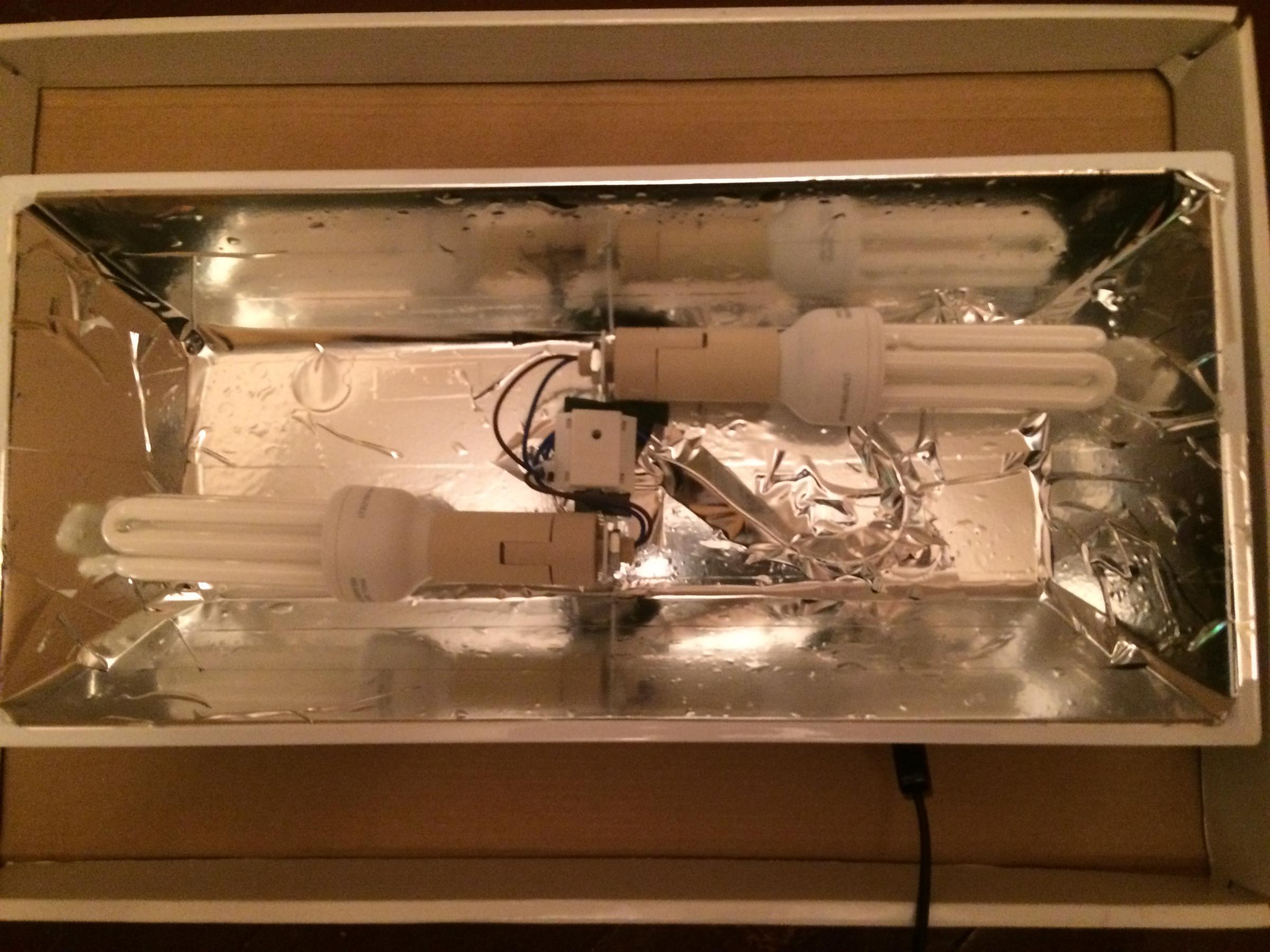 Можно ещё дырочки не заклеивать в верху, чтобы конденсат не копился. Оголённые провода лаком покрыть. Можно наверное и четыре лампочки вкрячить, с разным спектром, пару переключателей для раздельного включения если короб жёсткий.