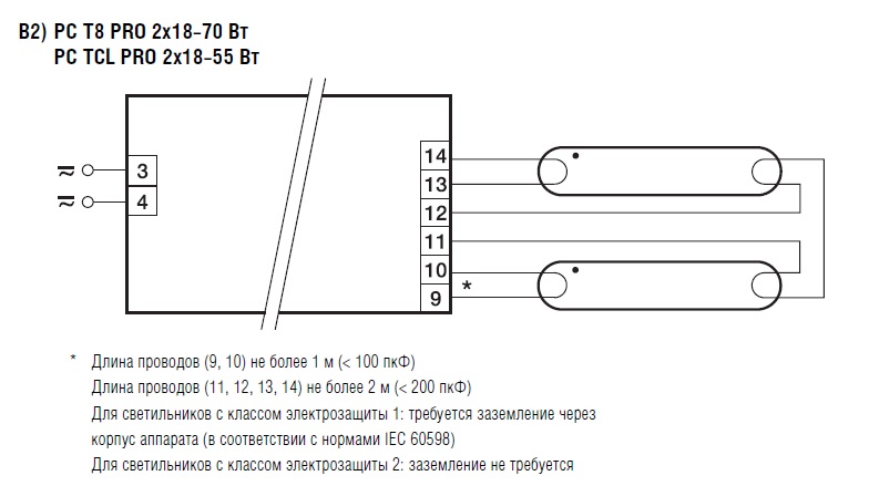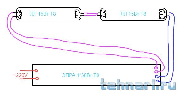 А вот схема в корне не правильная, у ЭПРА на ДВЕ лампы 6 (ШЕСТЬ) выходов!!!! (помимио 2 на питание, или 3 ( если есть земля) )