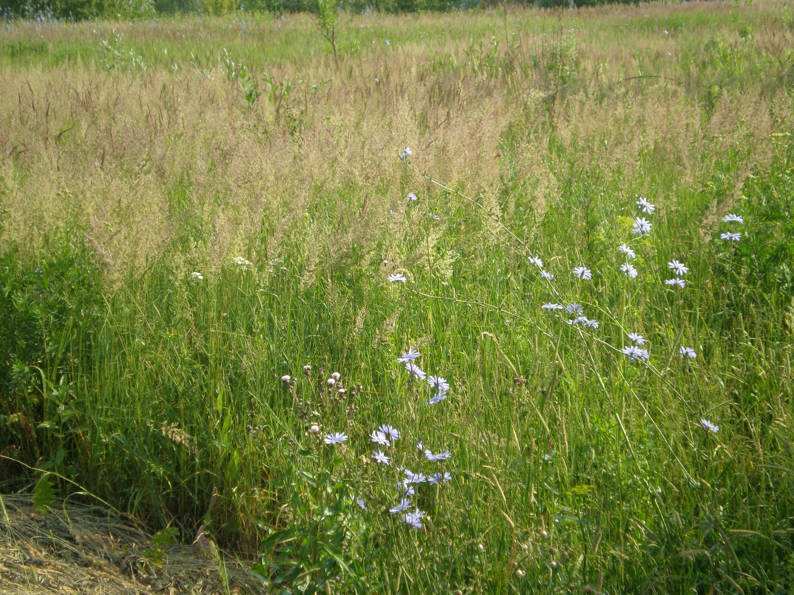 У нас что трактор не убил, то доскашивали черны молодцы с бензокосами. Теперь вокруг скучно, душно и сухо. Цикорий и ромашка лежат мертвым сеном, которое никто убирать не спешит.