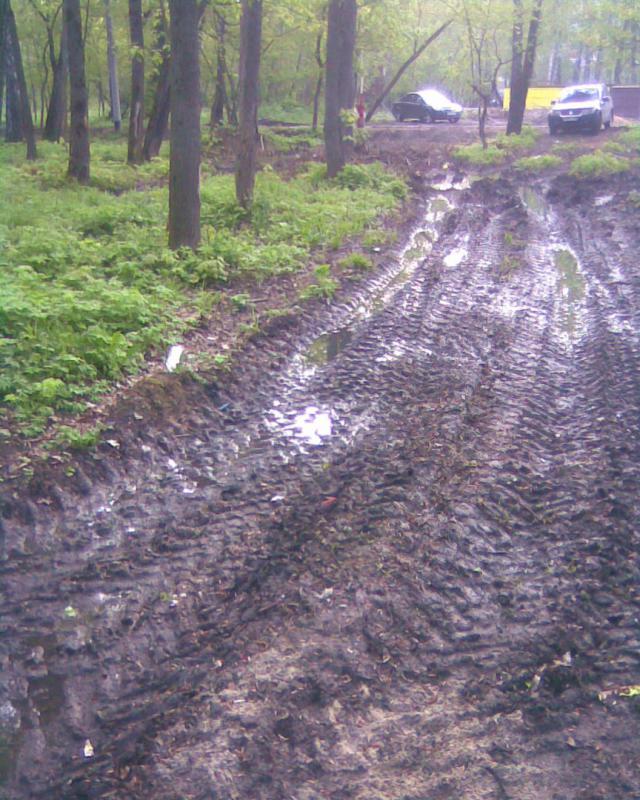 Помимо того что для укладки нескольких метров новой дорожки к 17 школе трактором размесили старую, еще и землю испортили, между кустов и стволов совершенно безобразные колеи, по всему парку.