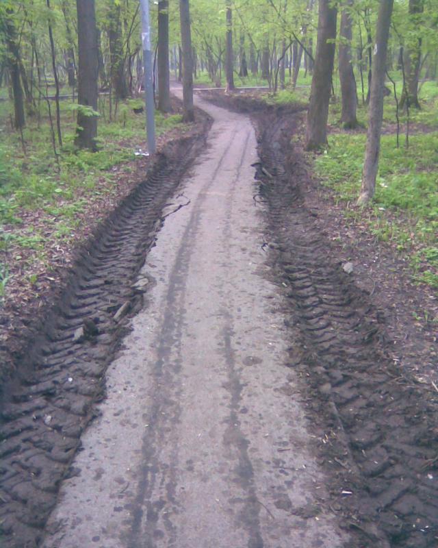 Помимо того что для укладки нескольких метров новой дорожки к 17 школе трактором размесили старую, еще и землю испортили, между кустов и стволов совершенно безобразные колеи, по всему парку.