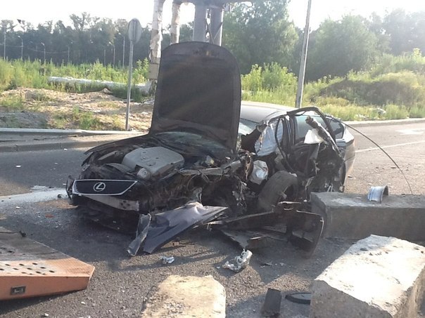 Лексус примерно на скорости 100 км/ч по дуге собрал целую пачку блоков, покрошил их, перевернулся и встал на колеса. Все на моих глазах. Водитель бы в очень тяжелом состоянии. Даже не знаю его судьбу.