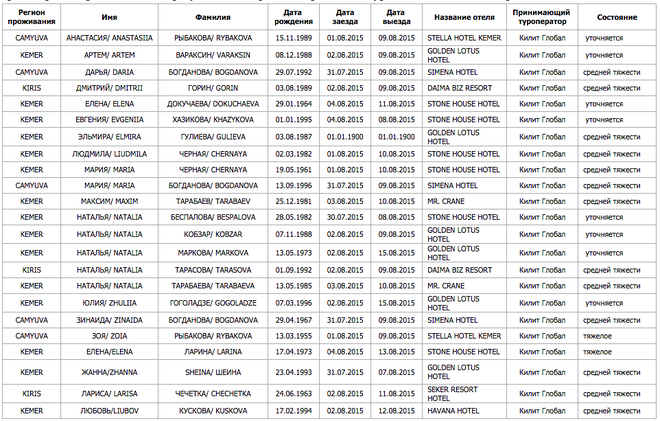 Генконсульство также опубликовало список раненых в аварии россиян. Пострадавшим от 19 до 52 лет. Степень тяжести состояния некоторых их них еще уточняется. Известно, что все пострадавшие доставлены в местные медучреждения, где им оказывается необходимая помощь.