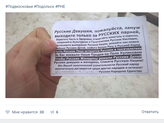 Портал "Подмосковье сегодня" с чьей-то подачи написал вчера: "В подмосковном Подольске раздают листовки с призывом к русским девушкам выходить замуж только за русских