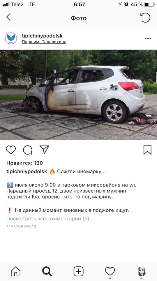 Показания свидетеля:во вторник утром двое неизвестных сожгли иномарку сотрудника муниципальной компании по оказанию ритуальных услуг возле учреждения, где он работает, сообщил «РИАМО в Подольске» свидетель происшествия. «Во вторник (3 июля – ред.) около 9:00 в Парковом микрорайоне в Подольске возле дома на улице Парадный проезд, 12, двое мужчин в черных балахонах подбежали к иномарке Kia и что-то бросили под нее, после чего машина загорелась.