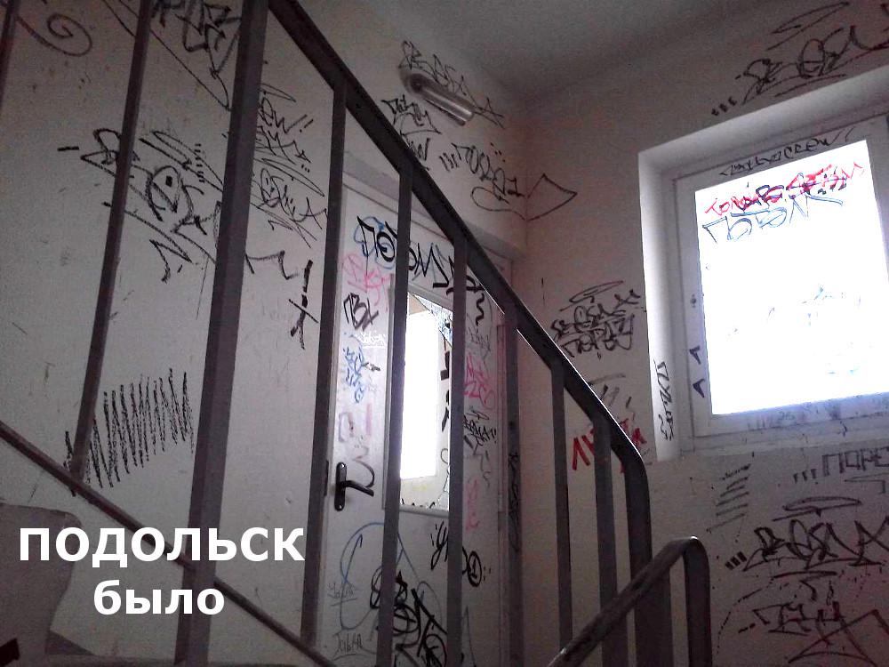 http://www.podolsk.ru/news/n26136.htmlВ доме № 5 в Электромонтажном проезде Подольска, которому всего 5 лет, все стены были испещрены надписями и рисунками. Кроме того, в окнах не хватало стекол, а на дверях – ручек и доводчиков. Предписание об устранении всех нарушений исполнило МУЖРП-4 города Подольска.