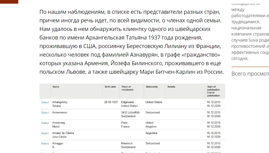 Швейцария опубликовала имена владельцев невостребованных счетов