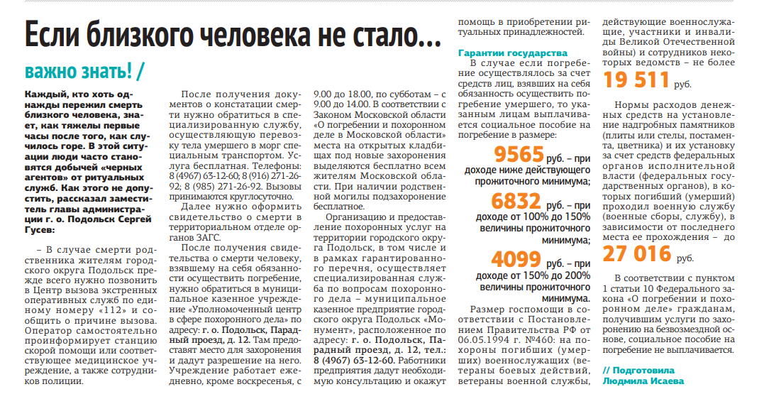 Памятка для родственников умершего в Подольске: куда звонить и т. д.
