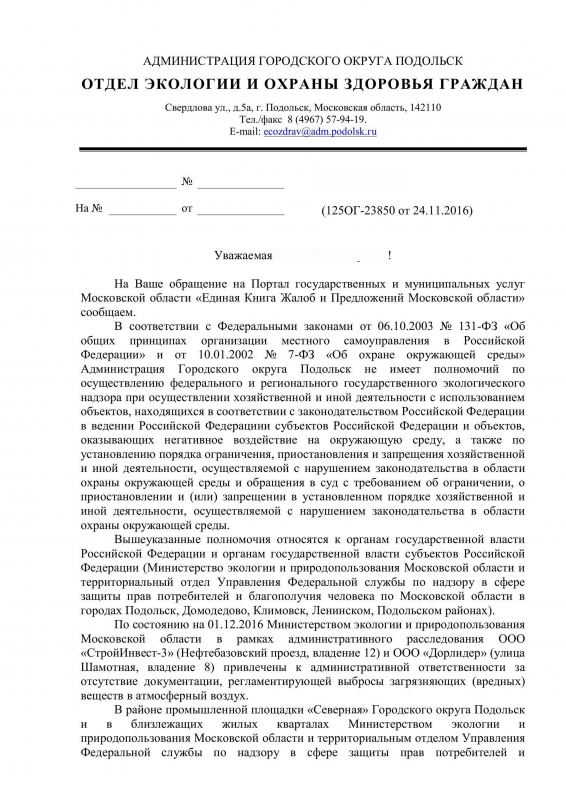 Территориальным отделом Роспотребнадзора проводится административное расследование по выбросам загрязняющих веществ в атмосферный воздух предприятиями, расположенными на территории северной промзоны Городского округа Подольск. Поводом послужили многочисленные обращения местных жителей, жаловавшихся на загрязнение воздуха в конце октября-начале ноября 2016г.