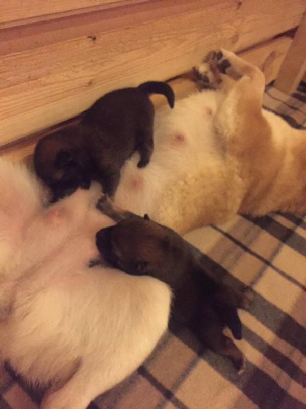 по окрасу будут скорее всего как Шант , красный (рыжий) сезам. Мама Шойка мужественно родила этих богатырей- 270 и 300 гр , для щенков сиба -это очень приличный вес. Дети активные -сразу запищали и присосались, как пиявочки.