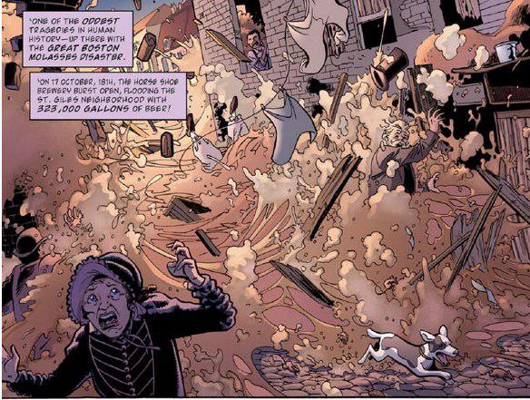 На пивоварне «Мо и компания» (англ. Meux and Company Brewery) на улице Тотенхем-Корт-Роуд (англ. Tottenham Court Road) взорвалась цистерна с пивом объёмом 610 тысяч литров, вызвав цепное разрушение остальных баков в здании. В результате почти 1,5 миллиона литров пива выплеснулось на улицы. Пивная волна разрушила два дома и пробила стену паба «Tavistock Arms», завалив обломками барменшу.