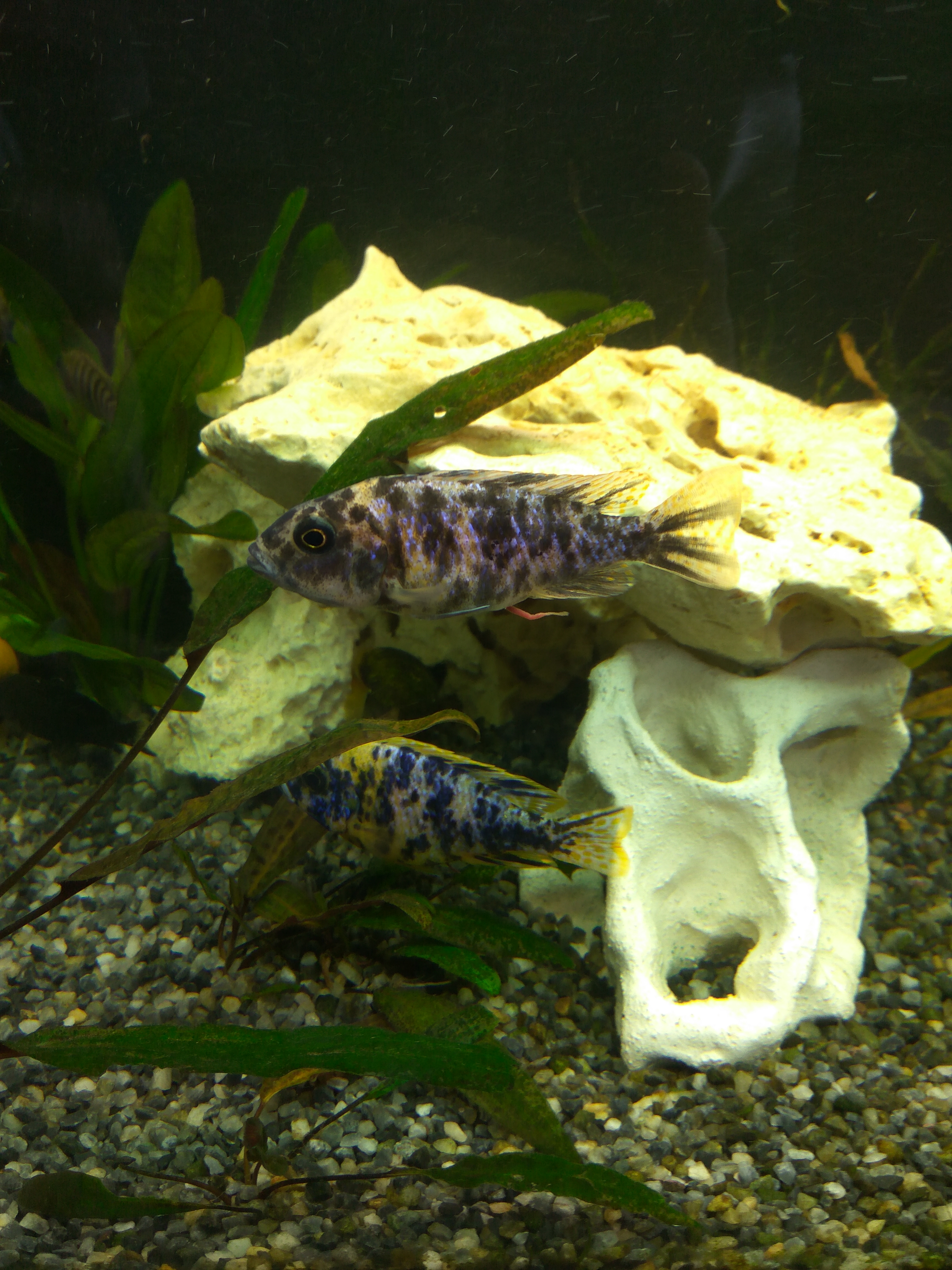 Пробовал лампы и на 4000К и 2700К разные комбинации из них и Ювеля, и опытным путём пришёл к той схеме что написал выше. Рыбы смотрелись отлично, все точки, переливы и блёстки на чешуе просматривались отлично. С удо и газом трава росла при таком свете вёдрами. После перехода на цихлид приходится включать по таймеру ОСРАМы на 3 часа "в полдень", всё остальное время светят Ювели только, световой день сейчас в цихлиднике всего 10 часов, иначе прут водоросли. Фото как выглядит рыба при такой схеме освещения прилагаю.