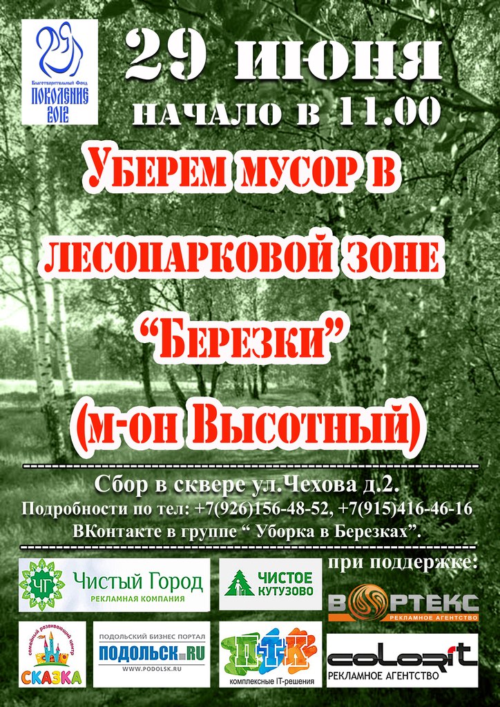29 июня состоялась экологическая акция по уборке лесопарка «Березки» (мик-н Высотный, Шепчинки) организованная Благотворительным Фондом «Поколение 2012» совместно с проектом «Чистое Кутузово». Целью таких акций является привлечение внимания горожан и в первую очередь жителей близлежащих районов к сохранению зеленых насаждений и поддержанию чистоты в лесопарках. Чисто не там, где убирают, а там, где не мусорят! Очень просто возмущаться о беспорядке, в кругу друзей, соседей, сидя на лавочке в чистом дворе и очень трудно выйти из зоны комфорта и попытаться сделать уютным не только свою квартиру, свой двор а и небольшую часть своего родного города. Уважаемые подольчане, почти в каждом районе нашего города есть небольшие зеленые зоны, которые планомерно превращаются в свалки! Не нужно ждать, когда город займется разгребанием этих свалок и в надежде на это продолжать их увеличивать. На уборку огромной свалки требуются немалые средства, а на то, чтобы этих свалок не было не нужно ничего, кроме одного – просто не кидать мусор!