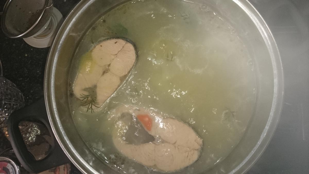 ), кладём в бульон уже нормальные куски рыбы и ещё их варим до готовности, добавив лаврушку, специи. В конце зелень.