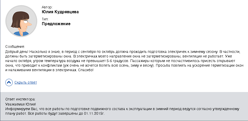 Помню была раньше горячая линия по жалобам на перегретые и холодные электрички. Вообще во всех электричках есть вентиляция, но на нашем направлении ее принципиально не включают - экономят электричество.DemonK писал(а):Ну шо "народ в стране не торт", это в другую тему.Ирина Подольчанка писал(а):А еще наш народ генетически труслив и безразличен, ему все по-фигу. Как бы чего не вышло. А вам совет, откройте форточку, только не полностью, а чуть-чуть, и сразу станет лучше. Не бойтесь.