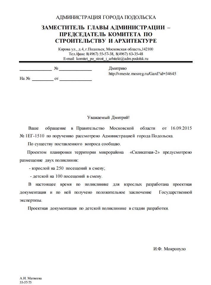 На вопрос через сайт Добродел по поводу двух поликлиник в нашем районе пришел ответ:
