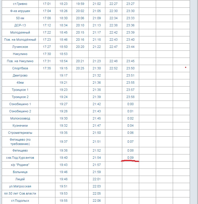 Последний рейс № 1030 до станции выкинул всех у Витязя, водитель сказал что мы едем в Автоколонну. Все спорили, что на сайте указано до ст. Подольск, но ему было плевать на этот минимум народа. Насколько правомерно, что последние рейсы варшавского и серпуховского направлений не едут до вокзала, а съезжают в Шепчинки в гараж? Пассажиры в районе 12 часа вынуждены добираться на попутных редких маршрутах Мосгортранс и троллейбусах.